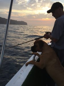 At the age of six months, Layla, a bullmastiff, earned her sea legs. Here, she takes her first voyage off the coast of Channel Islands, embarking at 5 a.m. for a fishing trip. Now an experienced boater, Layla owns a life vest and looks forward to her next trip!