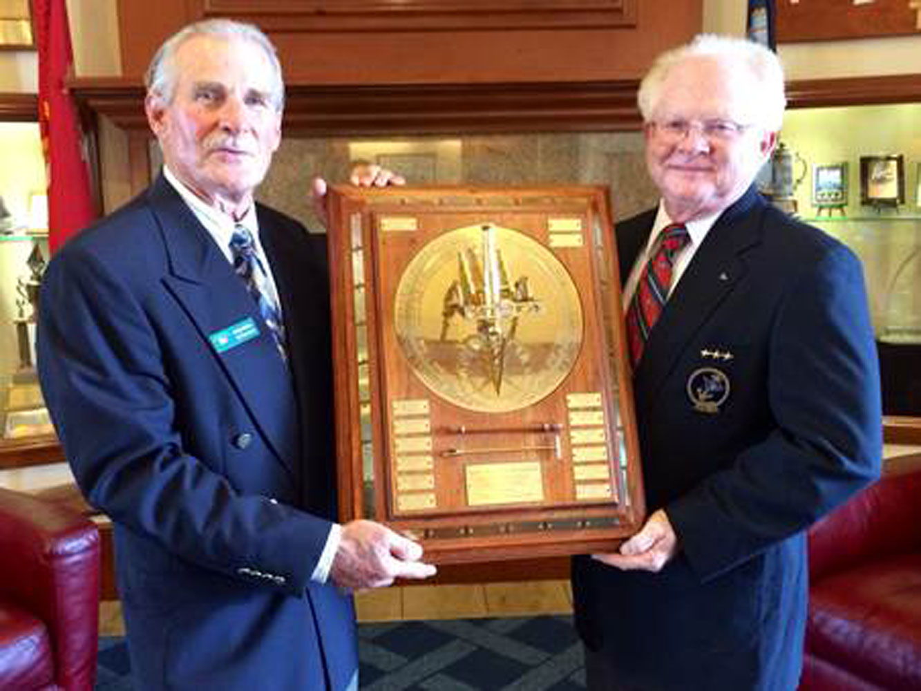 SAN DIEGO — Garry Adalian presents Coronado Cays Yacht Club Commodore Dave Fleck with the coveted Noon Day Cannon trophy for safe keeping at Coronado Cays YC where it will stay for a year until the next race held in Ventura.