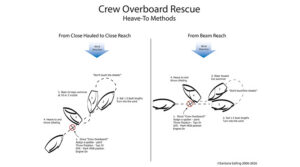 This graphic says it all and deserves your study and practice. I learned the heave-to method from Mark Howe at Aventura Sailing back in 1994. The heave-to rescue can be performed single-handed, and I demonstrate a single-handed rescue to introduce the skill practice in my classes. We have practiced this technique in up to 30 kts of wind. Most times we can make the rescue in 1-2 minutes. NOTE: keep the swimmer on the leeward side so the boat will blow toward them, not away from them.