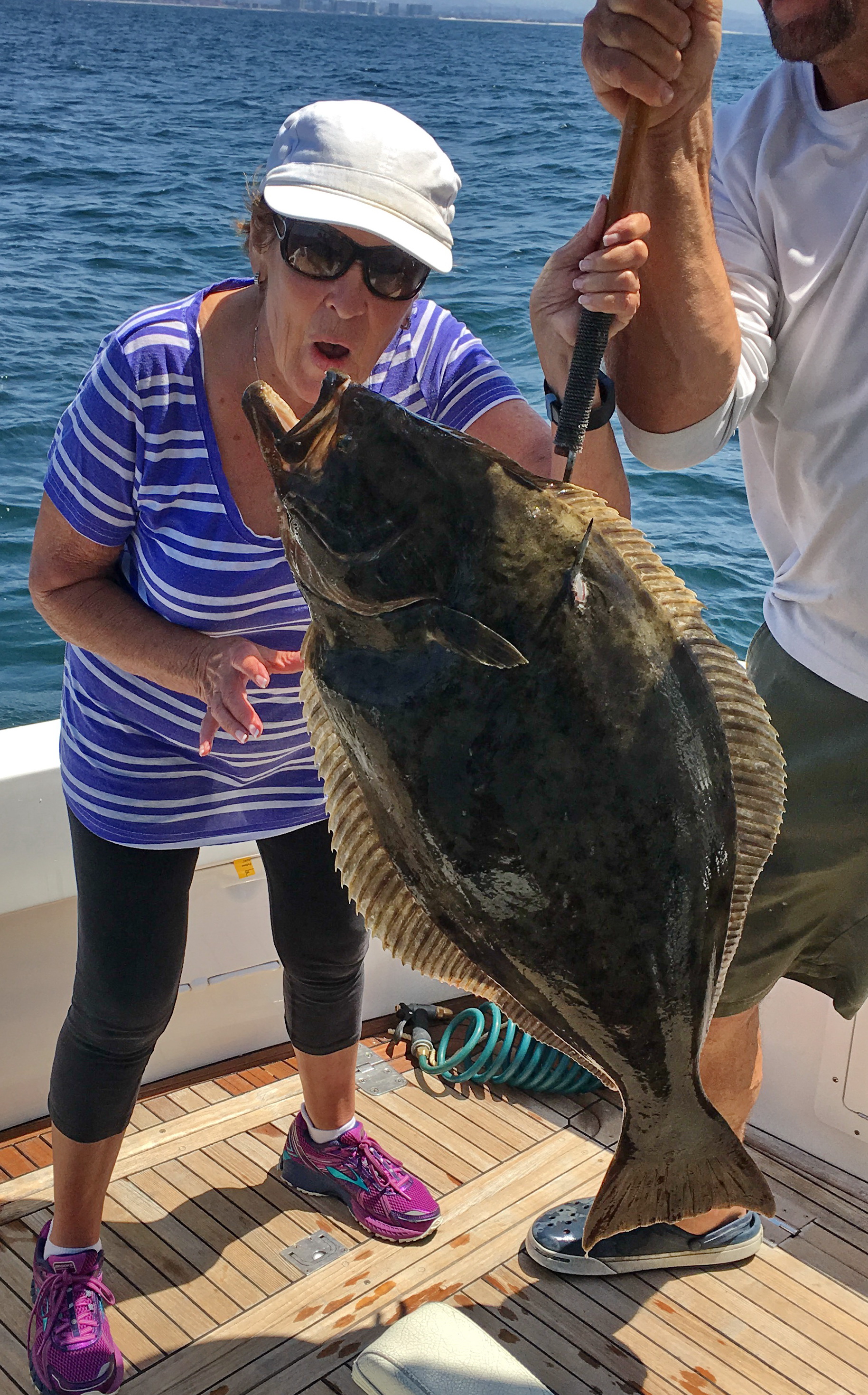 Arlene Raskin of Prescott, Arizona with her huge 20 pound Halibut caught on the Green Bee