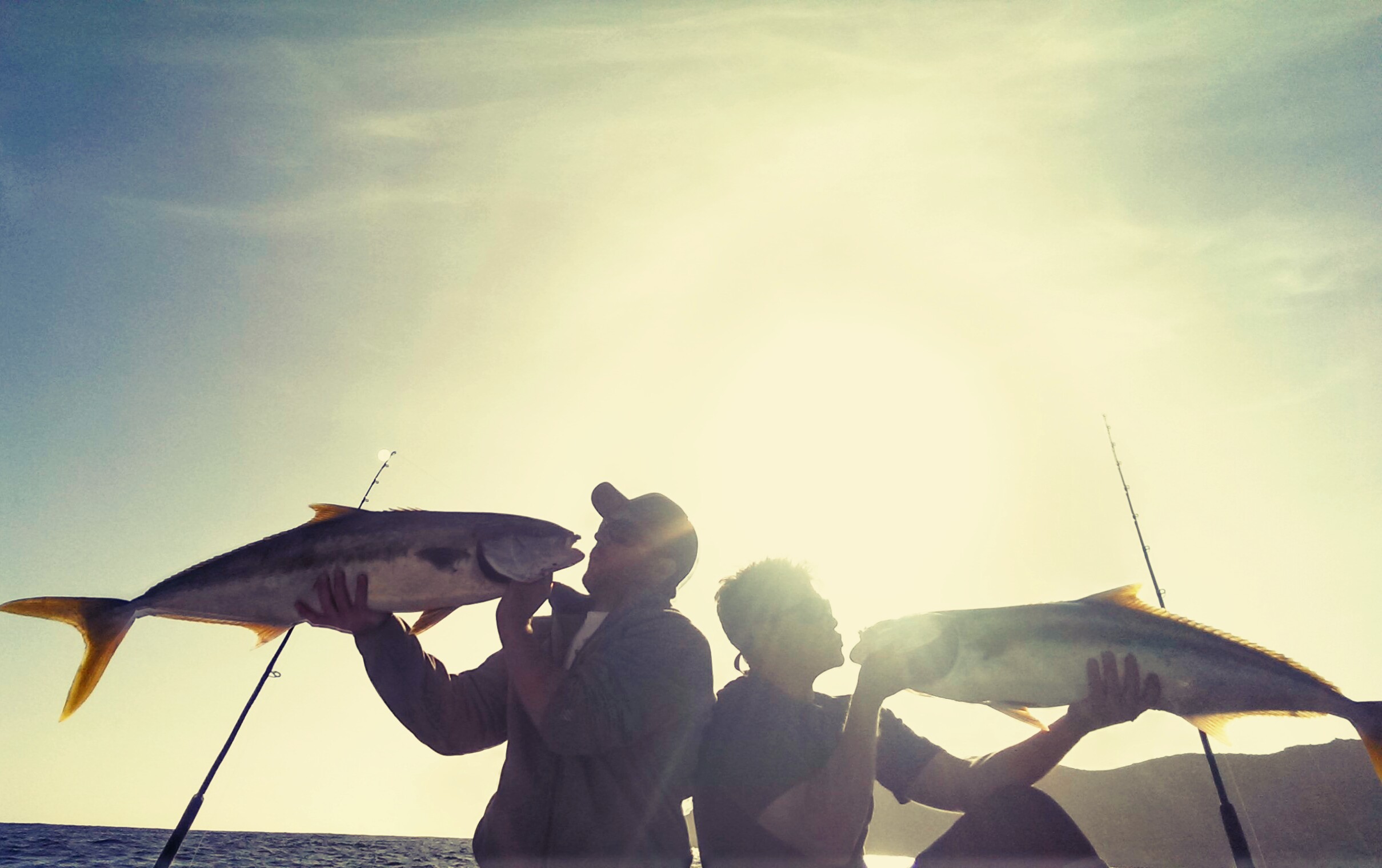 Yellowtail double date – Derek Todd and Neill Andrew smooch their catches during an April 23 trip to the Coronado Islands.