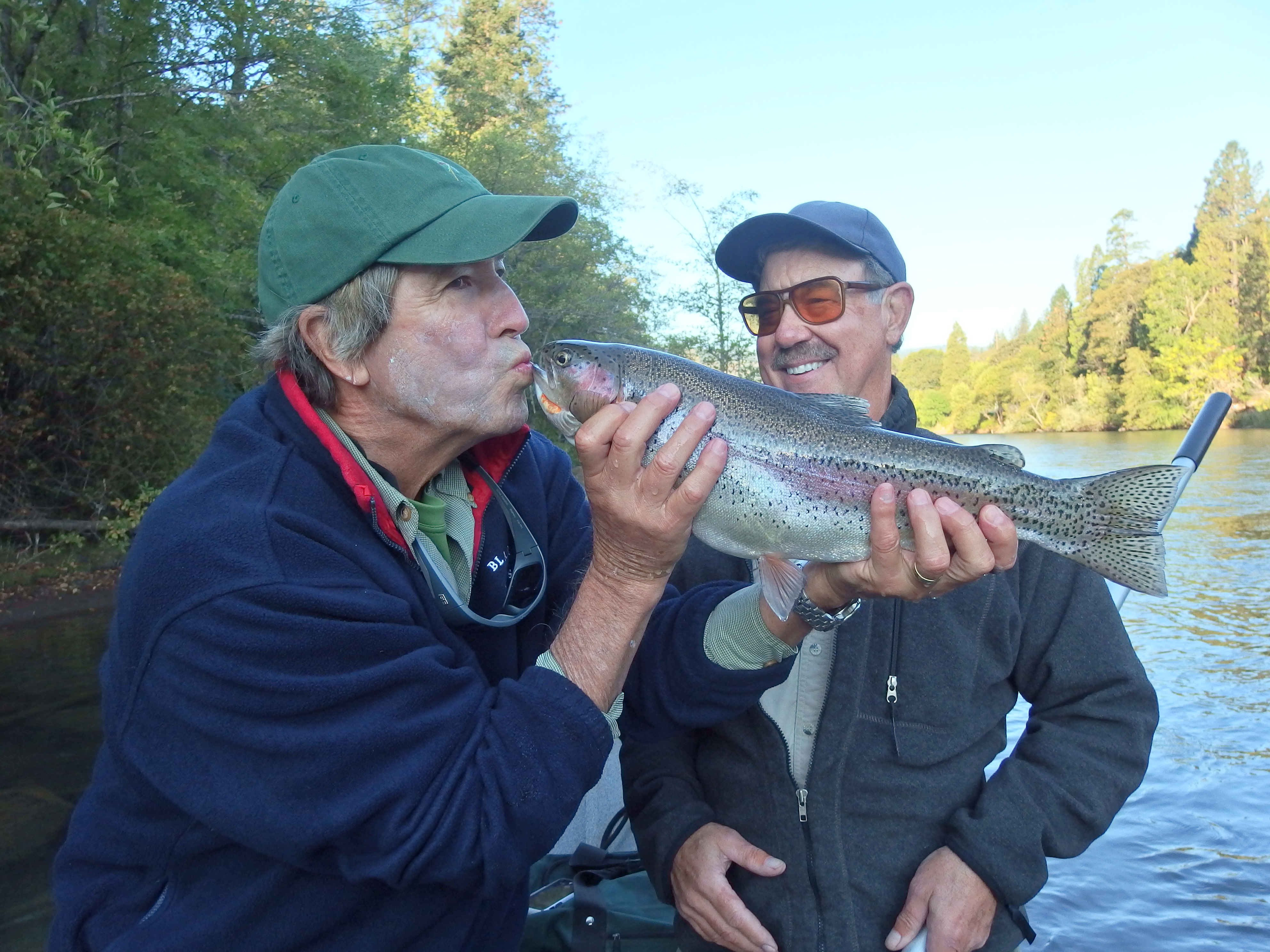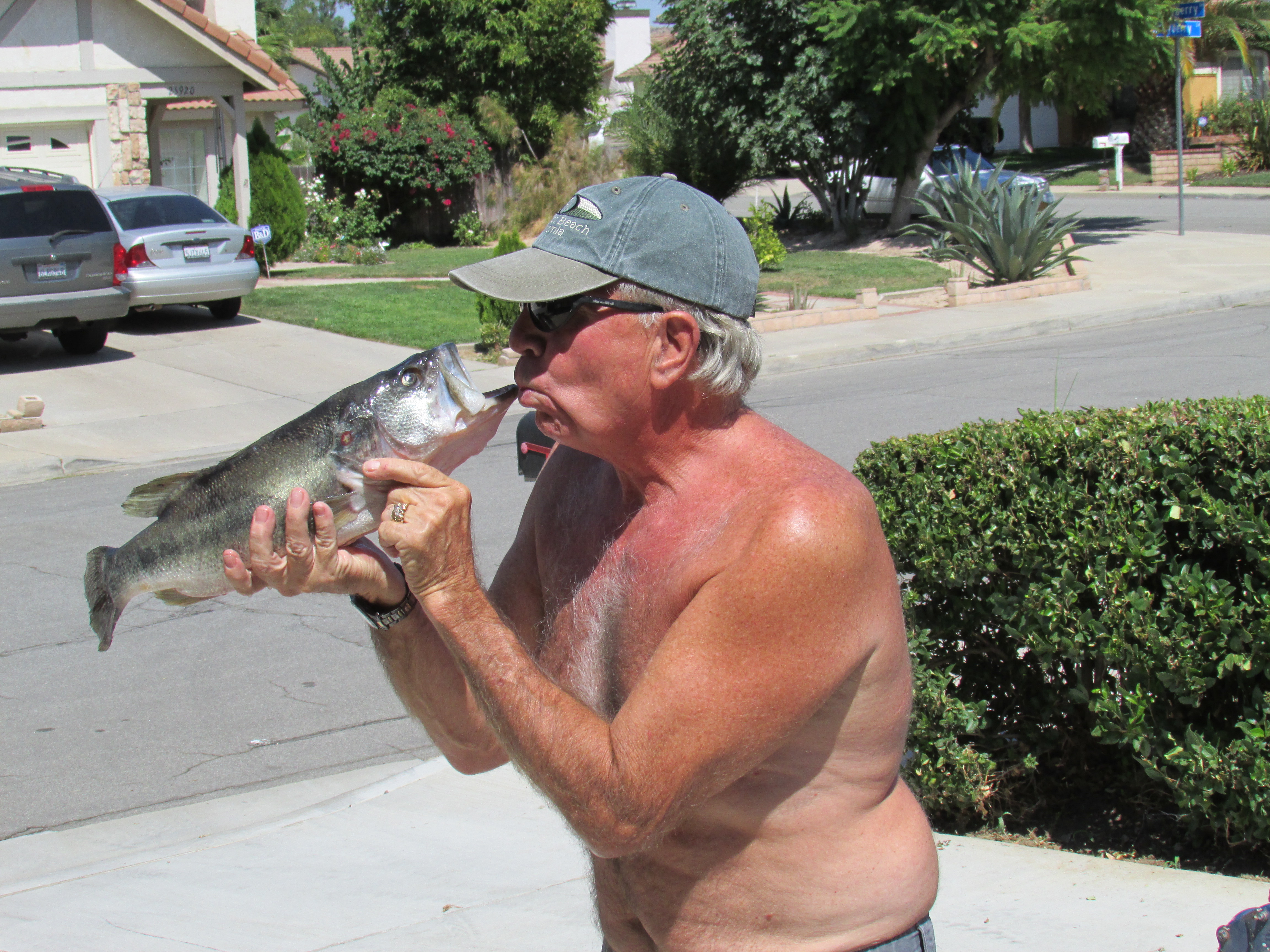 Big Kiss – Don Curran lays one on the fish he caught while trolling at Lake Perris.