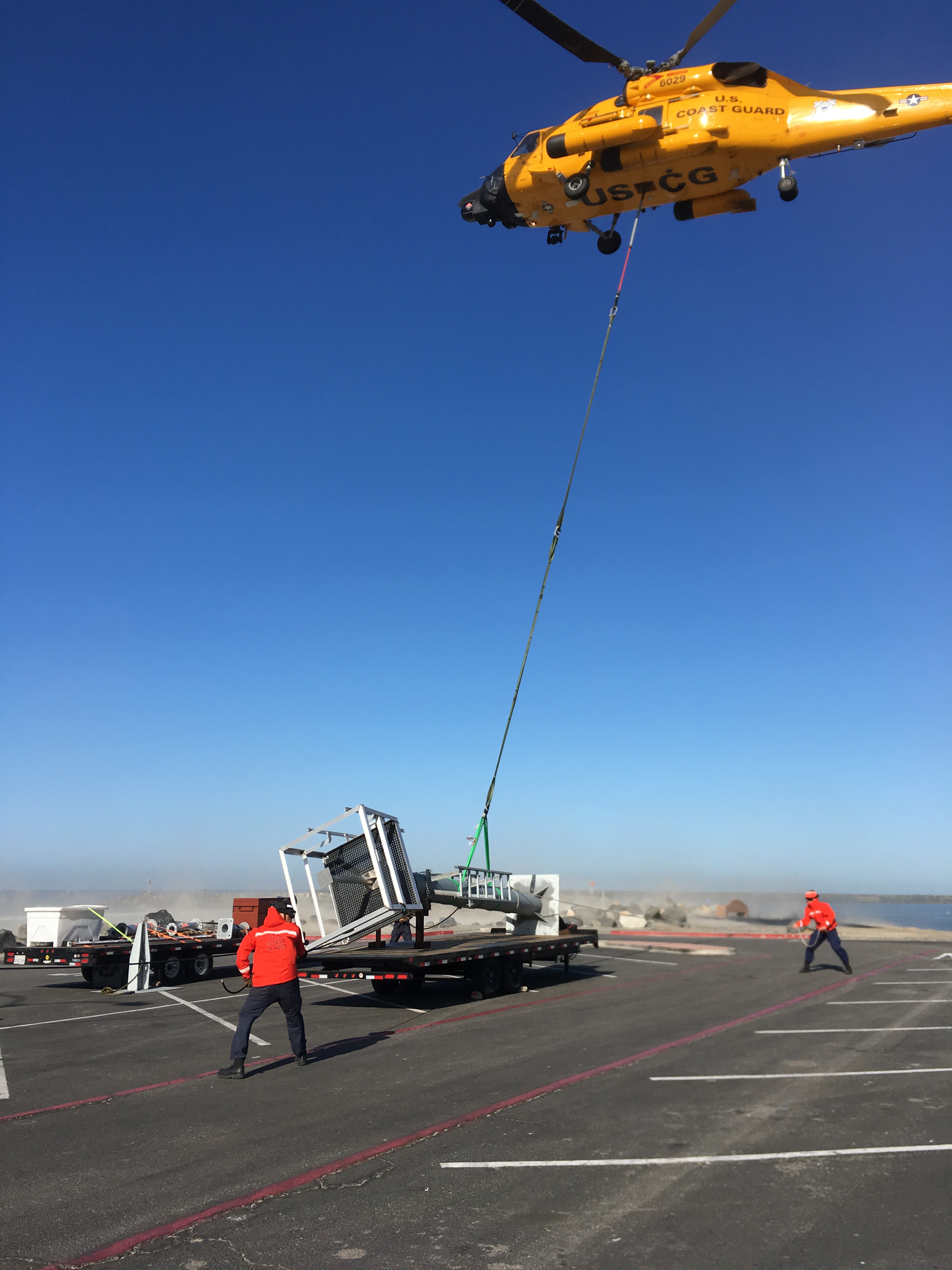 Originally the Coast Guard had planned to use Camp Pendleton for operations, but the request was denied. Instead, the equipment was flown to parking lot 12 at Harbor Beach. It was an impressive sight to watch the materials air-carried into the parking lot, according to staff at Oceanside Harbor.