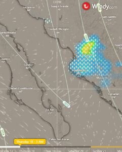 But what if the Millers encounter the “off” part; zero wind? There’s almost zero commercial traffic on that route since the ferry closed, so they won’t risk a collision if they have to drift around out there for hours. They might even catch a nice dorado as the water warms. But they would have to make landfall at San Carlos in the dark so might have to wait for daylight to pick their way into the unfamiliar port.