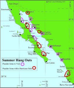We’re glad to hear that La Niña may lessen our risk of hurricane disasters, but at this time of year, boaters who are summering over will be moving north in the Gulf of California. My little map shows some interesting areas for boaters to visit (pink circles) and other interesting places to visit that also have quick access to a hurricane hole (red circles).
